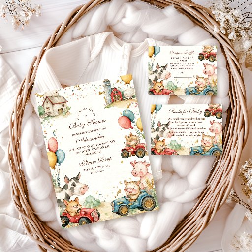 Celebrate in country style with this charming barnyard baby shower design. Featuring watercolor farm animals like cows, pigs, and playful piglets in toy cars, paired with balloons and a rustic red barn scene. A perfect choice for families who love the countryside and want a fun, whimsical farm theme.