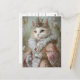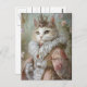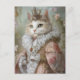 A regal white and light brown cat is the main subject, centrally positioned in a portrait-style image. The cat wears a jeweled crown and a lavish pink and gold gown, complete with a large, white ruffled collar. The feline's eyes are green and intelligent, conveying a sense of nobility and composure. Its pose is upright, suggesting dignity. The setting appears to be a floral garden, with subtle pink flowers and vines visible in the background. The lighting is soft and even, highlighting the textures of the cat's fur and the fabric of its clothing. The artwork is rendered in a realistic, painterly style with attention to detail. The atmosphere is elegant and whimsical, reminiscent of classic portraiture with a touch of fantasy. The perspective is at eye level, presenting the cat as the central and commanding focus of the scene.