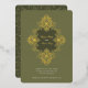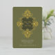 This exquisite wedding invitation features an intricate Baroque ornament design in radiant gold foil against a rich olive green background. The ornate detailing frames the couple’s names and event details, adding a luxurious touch to the overall aesthetic. The reverse side continues the opulent theme with a matching Baroque-inspired pattern, making this invitation perfect for formal weddings that embrace classic elegance and grandeur. Ideal for couples seeking a timeless and sophisticated design, this card is sure to make a lasting impression.