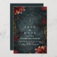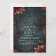 An opulent gothic wedding design featuring dark botanical flourishes, rich burgundy florals, and antique gold baroque framing. Set against a textured charcoal background, this moody composition is ideal for romantic Halloween weddings, alternative ceremonies, or dramatic vintage affairs. Fully customisable for names, date, and location—crafted for couples with a flair for the mysterious and the magnificent.