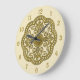 This elegant clock has an intricate gold filigree circle medallion resembling aged brass, surrounded by antique gold numbers. The background is cream coloured with a light repeating abstract floral pattern, which adds a feel of luxury. Add an extravagant look to your home with this clock.
