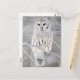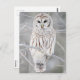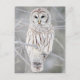Animal card showing a barred owl sitting on a snowy branch. The barred owl (Strix varia) is a large typical owl native to North America. It has a pale face with dark rings around the eyes, a yellow beak and brown eyes. It is the only typical owl of the eastern United States which has brown eyes; all others have yellow eyes. The upper parts are mottled grey-brown. The underparts are light with markings; the chest is barred horizontally while the belly is streaked vertically. The legs and feet are covered in feathers up to the talons. The head is round and lacks ear tufts, a distinction from the slightly smaller short-eared owl, which favours more open, marginal habitats.