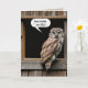 Barred owl with black framed eyeglasses in rustic barn window for getting old birthday humour.