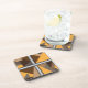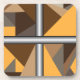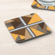 Barred hard plastic coasters. Barred is an abstract design created by Vexenwraith and consists of brown, orange, tan, and grey shapes behind silver gradient bars.