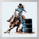 Pop art style graphic image in brown, blue and black of a girl racing with her horse around a barrel with her hair flying.