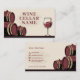 A business card with an illustration of barrels and a wine glass in beige and burgundy colour. It could be used for a wine cellar shop, a winemaker, a sommelier, etc. It includes opening hours on the back.