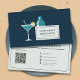 A business card with an illustration of a cocktail shaker and a martini glass on a dark blue background. Perfect for a bartender, a pub, a mixologist or a party barkeeper. On the back, you can find full customisable information and a QR Code.