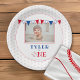 Cute Baseball 1st Birthday Party plates with a Photo / Cute birthday party plates for a 1st birthday party with a custom photo. The design has a baseball and bunting flags in red, white and blue colours. The background has a baseball pattern. Personalise this birthday party napkin with a child`s photo and child`s name.