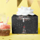 White Christmas tree with red socks and baseball ornaments on black background and snowflake.