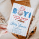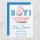 Cute sports theme baby shower invitation card featuring illustrations of a baseball and bat. The typography text says "oh boy! a little slugger is on the way." Blue and red colour theme.