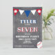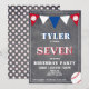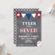 Baseball Ball Chalkboard Sports Kids Birthday Invitation. Cute baseball birthday party card. The design has baseball balls and bunting flags in red, white and blue colours on a chalkboard background. Personalise this birthday invite with a child`s name, age and personalise all the data on the invitation. Great as a birthday party invitation for a boy who loves baseball and sports.