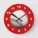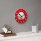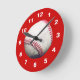 Photograph of a baseball in the centre of the clock with a burgundy background and white letters.