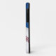 Custom baseball fan iPhone 5 case, with graphics of a blue on blue pattern background. Graphics of a baseball decorates the bottom right corner of the case and custom red coloured text, on the left side, is ready to personalise. Great phone case for the sports fan or baseball player.