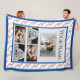 This custom keepsake blanket features a white coloured background with a baseball pattern background. The image of a baseball is tiled across the background of the blanket. A sample name is printed at the top which you can personalise to include your own name, custom message, or quote. A large photo is placed in the centre portion with four other sample family photographs placed in the bottom. A simple blue border frames the blanket.