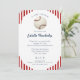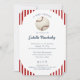 Vintage inspired red and blue striped pattern baseball theme baby shower invitation with baseball design and registry information on back.