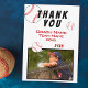 Baseball thank you coach card with photo, thank you text, coach name, team name, year, your name and baseball balls. The card is in white, red and black color scheme. On the back of the card are baseball balls. Photo thank you card - add your photo into the template. Personalize the card with names and your text.