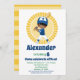 This boy's birthday invitation features a cute Hispanic baseball player in navy blue jersey with baseball bat on a yellow background.