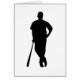 A simple silhouette image in black and white of a baseball player at bat. He's standing, leaning on a baseball bat. Add a personalised message to this design, or change the background colour.