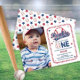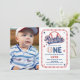 Cute distressed baseball-themed "Rookie of the Year" boy's first birthday party design. Features baseball-themed "Rookie of the Year" text with a baseball standing in for the "O" in "One" along with baseball stitching around the rounded rectangular frame. Front also features your child's photo. Back features a repeat pattern of red and blue distressed stars and baseballs.