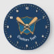 Baseball icon with two bats and a ball over a blue shield. Custom background colour. Custom text.