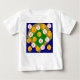 This baby t-shirt has a ball themed design of a ball field made from diamonds and half-circle and baseballs and softballs made of circles with threads.
