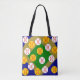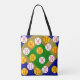 This tote bag has a ball themed design of a ball field made from diamonds and half-circle and baseballs and softballs made of circles with threads.
