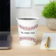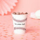 Cool custom baseball league party cup that looks like a ball with your personalised text in the centre. Add a team name for an end of season party or a player's birthday.