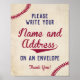 Display our vintage baseball themed baby shower sign to ask guests to address an envelope to themselves. Provide blank envelopes and some pens and let our sign ask your guests to write their name and address on the envelope. This will help the mummy to be save time and the hassle of finding addresses when it's time for her to write thank you notes!