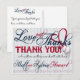BASEBALL WEDDING THANK YOU POSTCARD 2b-*This thank you post card is customised for a SPECIFIC CLIENT ONLY. This one is for them. Another leaving names off will be available. About the design: The background is covered with thin blue and white vertical stripes. Decorative glass Text on top reads: Love and Thanks. Next, is decorative red text that reads: THANK YOU! in print letters. A custom note in black cursive goes before the signature. Decorative glass signature with the the bride and grooms name. A small horizontal border of tiny baseballs run across the bottom. The back side of the post card has embellishments as well. The Love and Thanks glass text, the couples name glass text and the vertical baseball divider. This design is available as shown in blue and also in red. Don't forget to customise the notes on front and back in your own text. Edit the text areas or delete/clear them for a blank card.