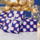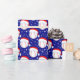 This Christmas wrapping paper features baseballs wearing Santa's hat with snowflakes twirling around on a Christmas navy background.
