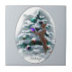 Basenji Christmas art is beautiful on a wide variety of holiday merchandise. This basenji is decorating a woodland tree, and appears to be asking his forest friends if this is the right spot to place the ornament!