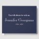 This elegant funeral or memorial service guestbook features the message "You will always be with us,", and the personalised name and birth/death dates of the individual who has passed on. It has white text on a dark greyish-blue background. It could be used to record cherished memories of somebody who has recently passed on.