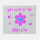 This image features a cheerful and colourful design with the phrase My mum is the Greatest" written in bright pink stylised font. At the centre, there's a cute flower with pink petals and a blue circular face, smiling warmly with blushing cheeks. Surrounding the flower are two pink butterflies and two pink outlined hearts, adding a playful and loving touch.