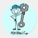A stick figure mechanic wears a blue cap and holds a big wrech on mechanic T-shirts, mugs, cards, stickers, bags, and other items perfect as gifts for mechanics!