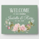 Beautiful, modern and elegant wedding welcome tabletop sign features watercolor flowers, perfect for Spring. Pretty pink roses spray bouquet with fully customisable white text on trendy basil green background.