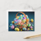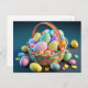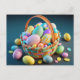 This holiday postcard features a variety of colourful Easter eggs resting in a cute basket.