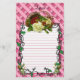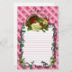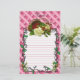A pink/red and lattice background, a lined white box with vines around it, a basket of red and white roses, and a couple of single red rose buds are on this stationary. Change the name at the top to whatever name you would like and you have stationary for yourself or a gift.
