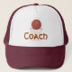 Painting of making the basket in basketball, with Coach, is printed on hats. Can be customised with team's name or no wording, etc.
