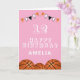 Basketball Ball Bunting Flags Kids Birthday Card. The design has basketball balls and birthday party bunting flags in orange, black and white colours on a pink background. Add your name, age and text and make your own birthday card. Great for boys and girls who love basketball.