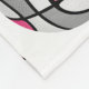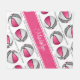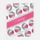 This cute basketball themed fleece blanket features the realistic images of basketballs that have alternating pink, white and grey panels arranged in an angled mirrored pattern - the phrase "The basketball court is my happy place" in a casual handwritten-style font in grey stretches between the angled rows of basketballs - athlete's name can be personalised on a similarly angled full width pink colour strip - background is customisable white - by katz_d_zynes