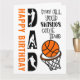 Cute Funny basketball themed birthday card for dad. The design is lettered with Happy Birthday Dad in oversized typography, decorated with basketball player silhouettes. The fun pun reads "may all your swishes come true" in decorative typography with an illustration of a basketball going in the net. The template is set up for you to add your custom greeting inside.