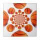The artwork features a central point from which numerous basketballs radiate outwards in a spiralling, kaleidoscopic pattern. The basketballs vary in size, creating a sense of depth and perspective. The iconic orange colour with black curved lines representing the ball's seams are consistently depicted across all the basketballs. Some larger basketballs are positioned around the periphery of the design, framing the central kaleidoscope. The background is a clean white, ensuring the focus remains entirely on the basketballs and the dynamic pattern they form.