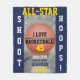 I Love Basketball is written in black typography against orange basketball in centre on a cool sparkling concrete background. Navy Blue background. School season Year written in white. All-Star, Player Number and Name written in yellow gold colour typography. To change background colour to your team colour, click Personalise and click on Background on left-hand side and select from colour palette, or enter a Hex Code Colour Number. To change the School Name and Mascot matching Blue font colour to your team colour, click on the text Layer field on left-hand side and select from text colour palette on right-hand side. Shoot Hoops is written in white. Original basketball text saying template Design and Photography © 2017, 2018 TamiraZDesigns.