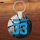 Personalised blue jersey number basketball keychain with name. Sporty present under 5$ for men / guys, women / ladies and children. Personalizable with funny quote, slogan, monogram, name or high school team name. Cool sports gift idea for basketball players, teammates and fans. Cute birthday party favour for senior students, teenagers or youth coach with little league boys and girls. Black and white ball photo with double digits. Create your own design for him and her. Make one for dad, mum, husband, boyfriend, girlfriend, brother, sister, wife, kids, coaches, employees etc.