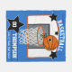 Basketball, hoop and backboard surrounded by stars player name jersey number and school or team name original design by Holiday Hearts Designs for TJsSportsmania (all rights reserved). All text colours and styles as well as star colours and blue background colour can be modified as desired.