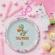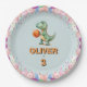 This personalised paper plate for birthday parties features a cute basketball player T-rex dinosaur surrounded by party balloons.