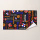 Sporty basketballs on a black colored background originally designed text name personalized towel. This typographical sports-themed ball patterned towel has traditional brown orange and blue red and red and black basketballs and can be customized with your own name, currently reads Benjamin. Contact me for longer name requests. Original art and design by Sarah Trett for www.mylittleeden.com