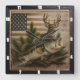This unique wall clock prominently features a largemouth bass leaping out of water, with a majestic deer subtly in the background. A rustic American flag and wooden texture complete the backdrop, creating a compelling blend of patriotism and outdoor sports. Ideal for hunters, anglers, or anyone who appreciates rustic wildlife art, this timepiece serves as a bold statement piece in any room.