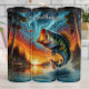This is a stunning and detailed illustration of a large bass fish leaping out of a lake at sunset. The fish, with its mouth wide open, is chasing after a fishing lure. The scene is set against a vibrant, fiery orange and blue sunset, with dramatic clouds and a forest of pine trees. The water splashes dynamically around the fish, and a small wooden dock is visible in the background. The overall aesthetic is one of energy, adventure, and natural beauty.