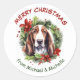 These pretty Holiday stickers feature a beautiful watercolor portrait of a Basset Hound dog. The dog is framed with a pine bough, holly, red berries, and poinsettia wreath. Your custom text is in red and green above and below the image. Perfect for your Christmas correspondence or gift packages.